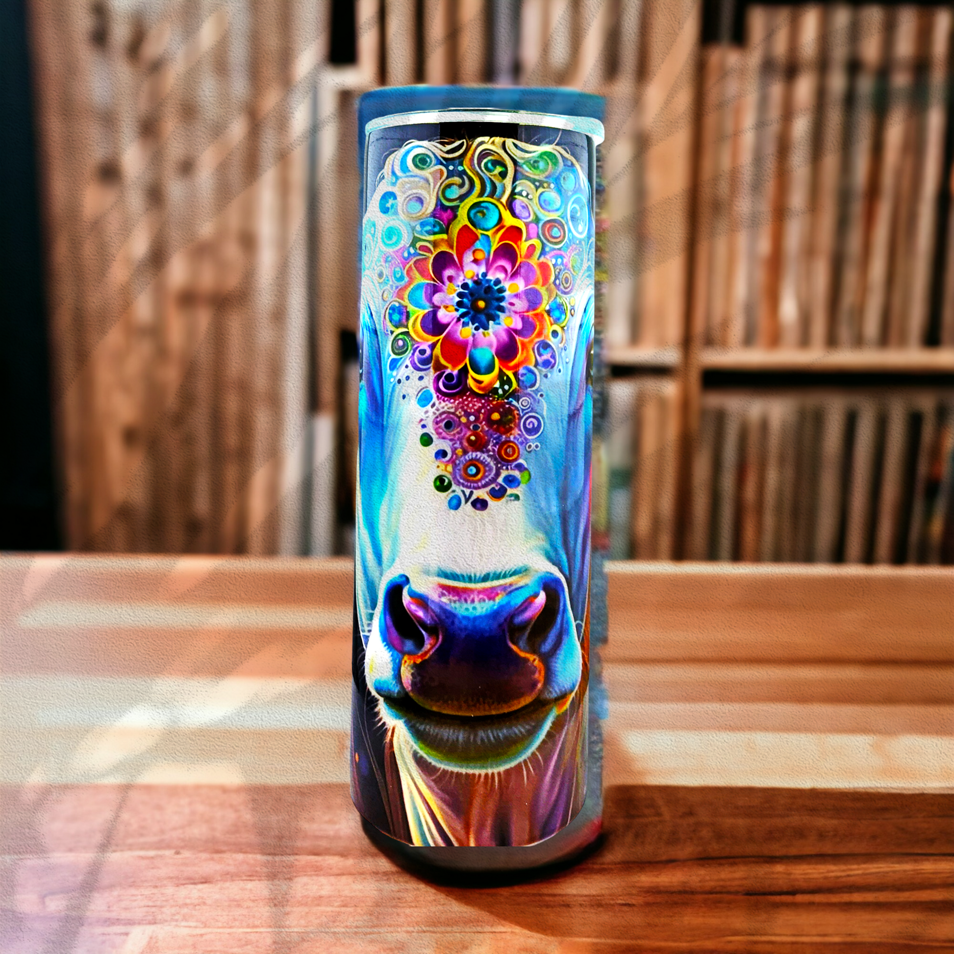 Stay hydrated on the go with the Third Eye Cow 20 Oz. Stainless-Steel Hot/Cold Tumbler. This tumbler is designed to keep drinks hot or cold and the double-wall vacuum insulation means that your beverage stays the same temperature regardless of the weather. Perfect for morning coffees and afternoon teas.