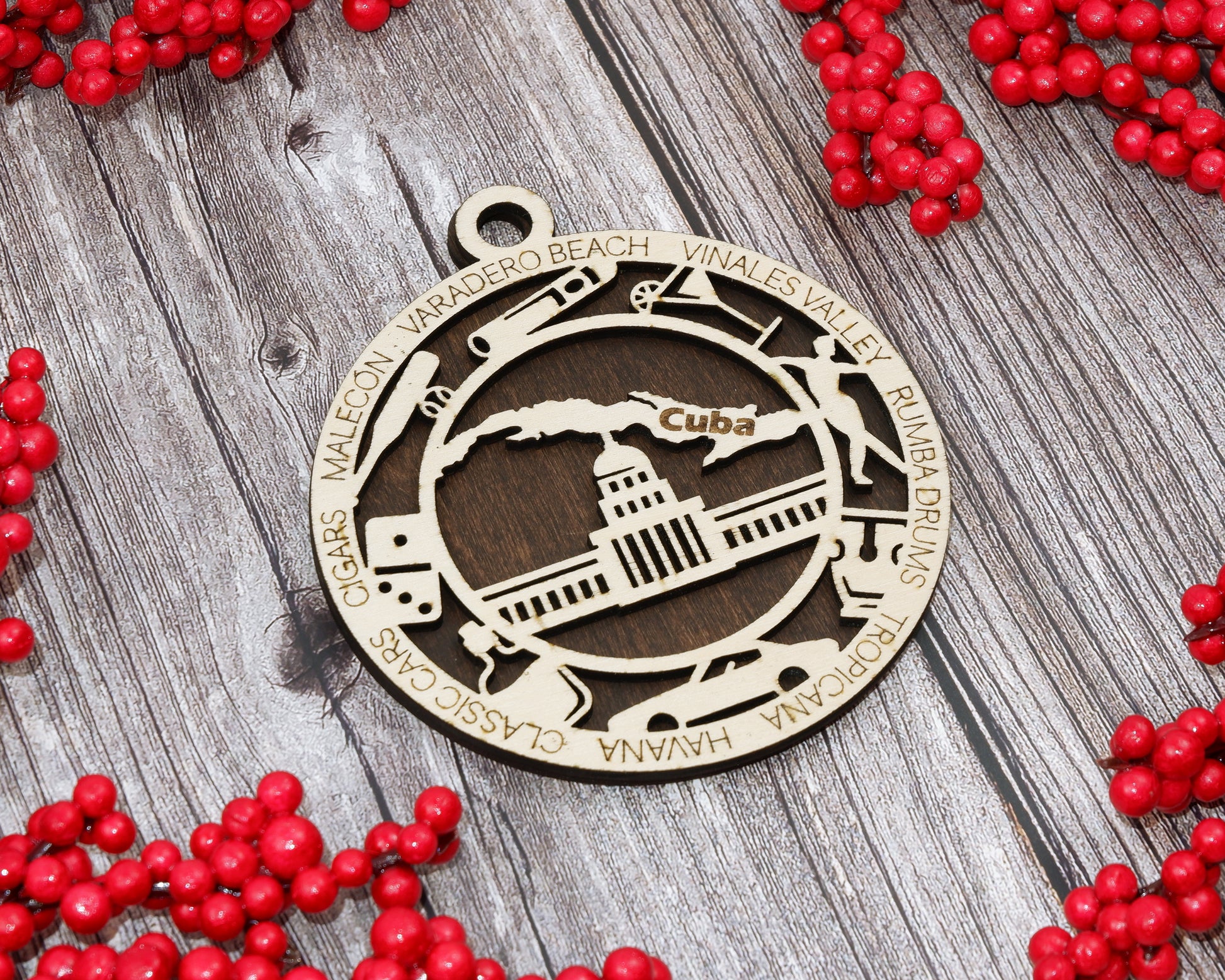 Add a splash of Caribbean flair to your tree with this Cuba Ornament! Celebrate the island's colorful streets, rhythmic music, classic cars, and warm hospitality with this playful keepsake. Perfect for those who've danced under the stars in Havana, sipped mojitos on pristine beaches, or simply dream of Cuba's vibrant culture and charm. Hang it proudly and let it transport you to a world of salsa, sunshine, and unforgettable memories. A delightful treasure for any holiday collection.