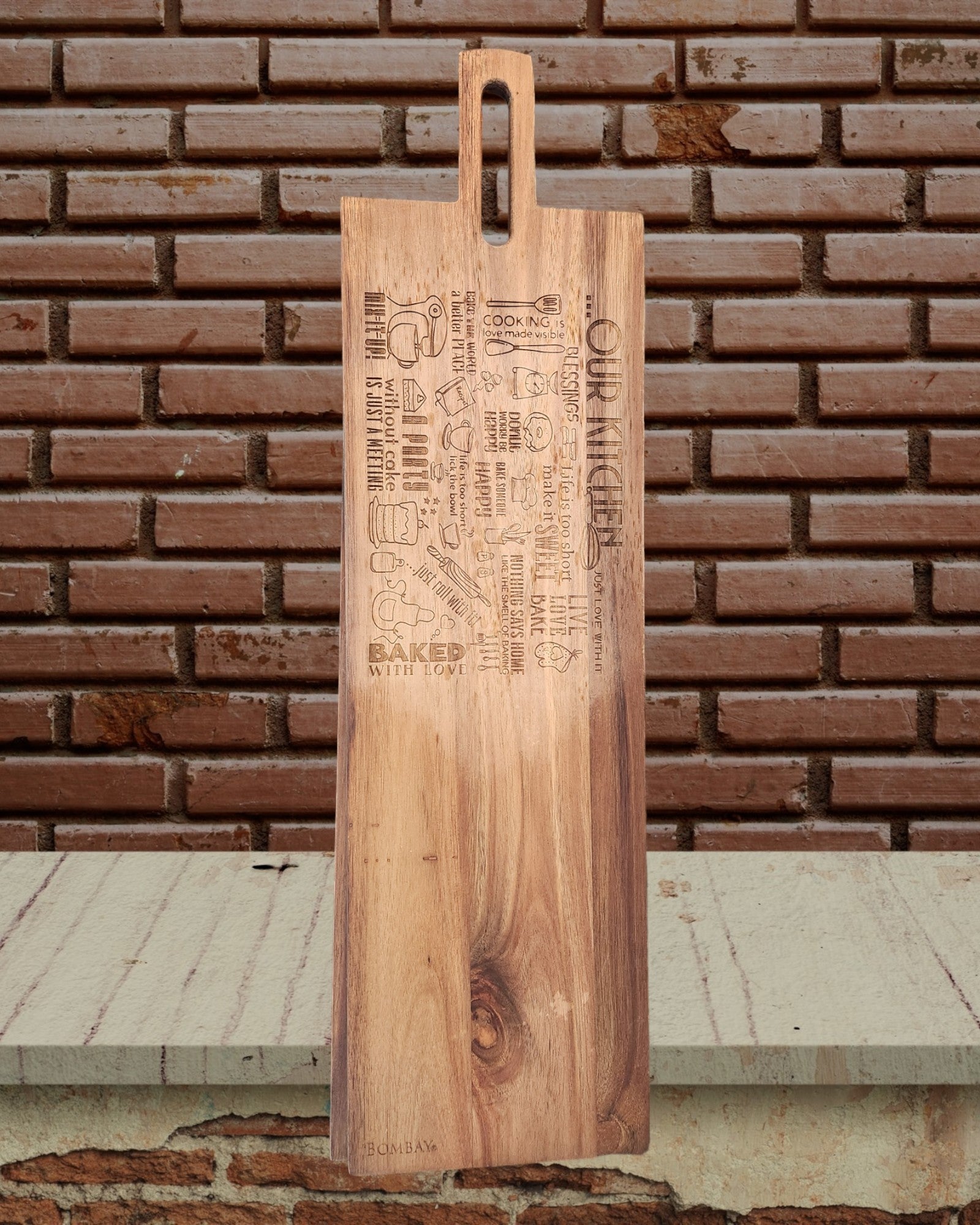 Serve up some serious style with this long acacia wood serving board from Our Kitchen. Made from sturdy and beautiful acacia wood, this board is perfect for serving up your favorite cheeses, meats, and small bites. Elevate your hosting game with this unique and stylish serving board.