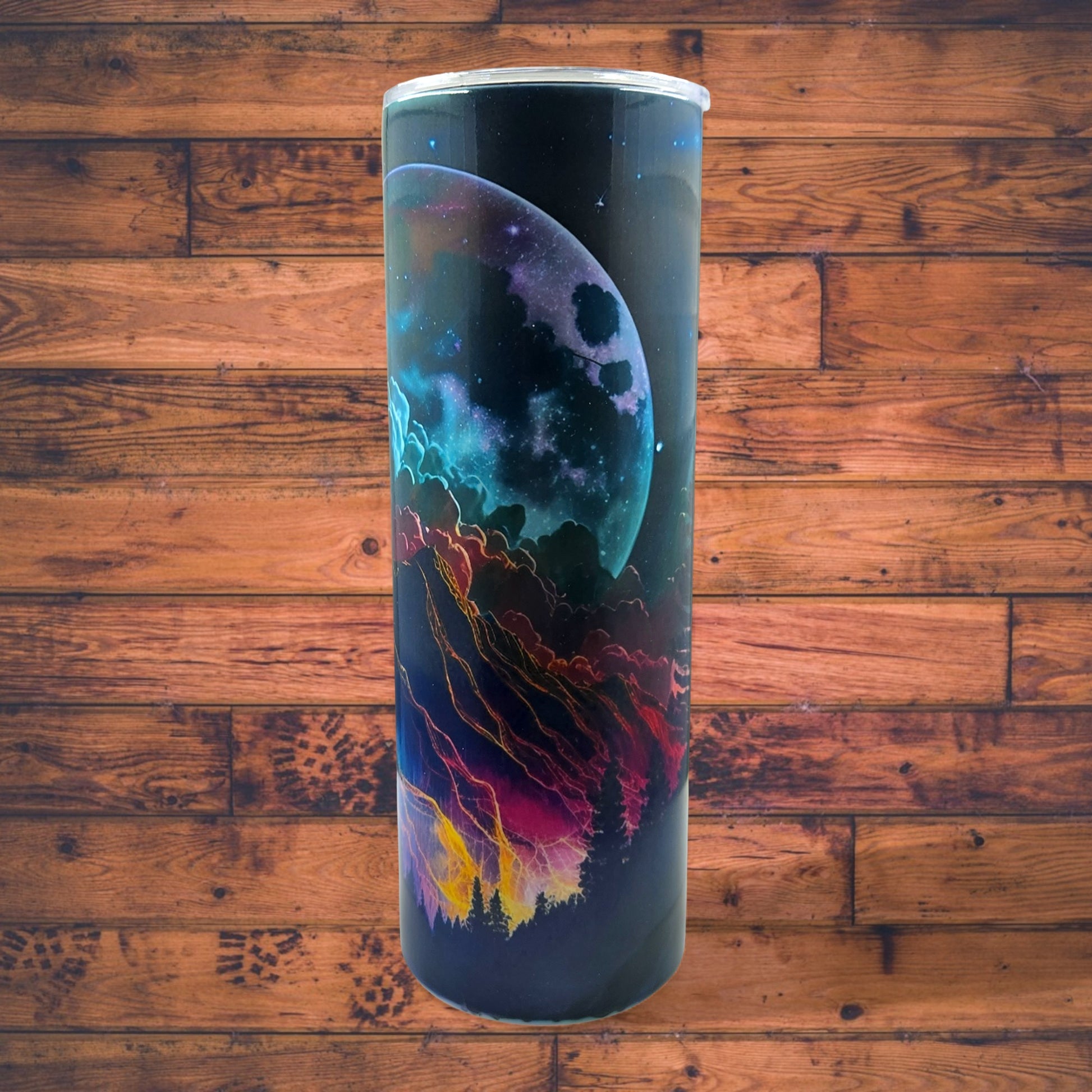 Stay refreshed with this stylish 20 Oz stainless-steel tumbler featuring a pastel moon amongst clouds and mountains. Insulated construction keeps beverages hot or cold for longer and its rust-resistant design is perfect for everyday use. Stay cool and hydrated with this must-have accessory!