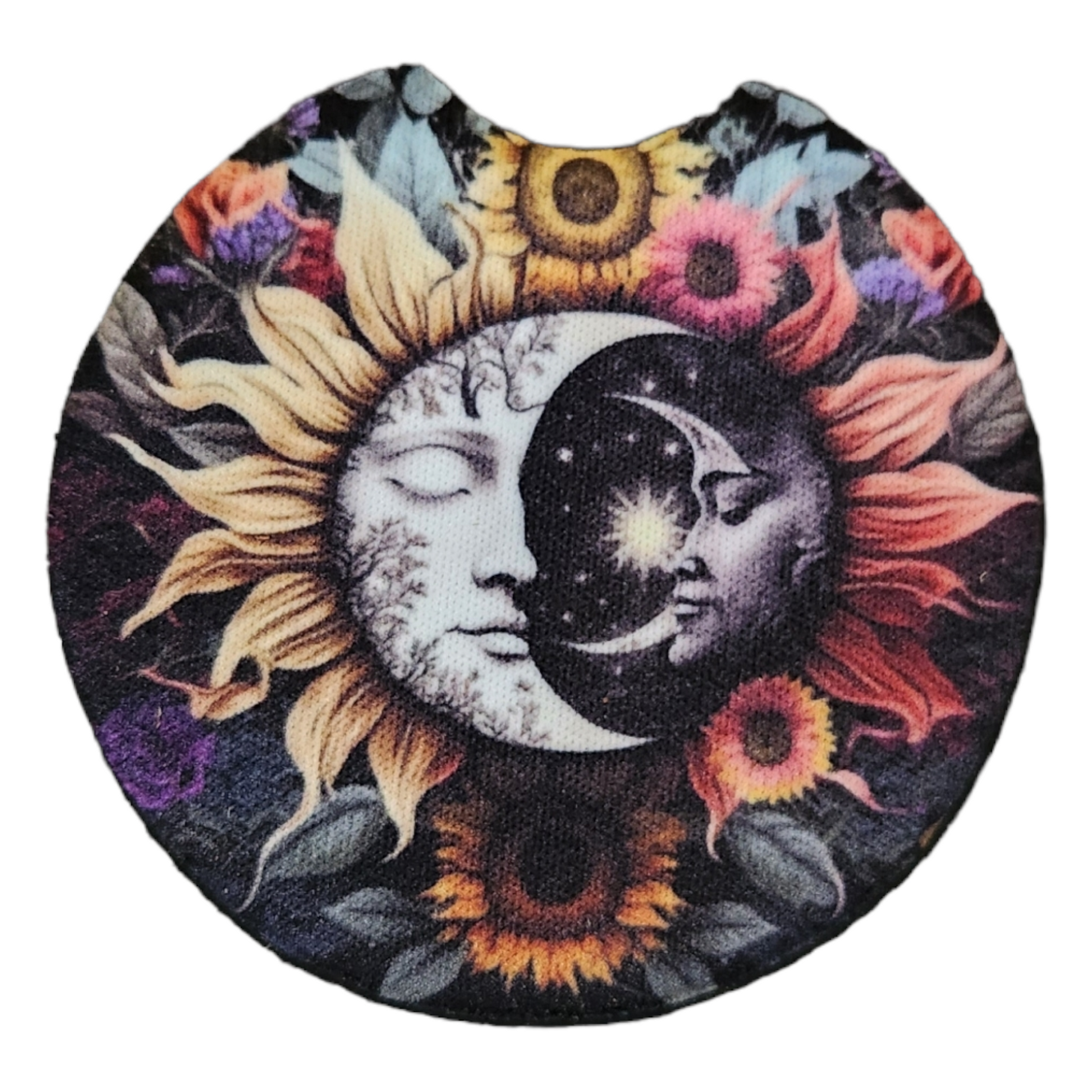 Go beyond the bounds of regular car coasters - embrace the Sun and Moon with this fun and practical car accessory. Crafted of durable neoprene, take this coaster on all your adventures and make each drive unique!