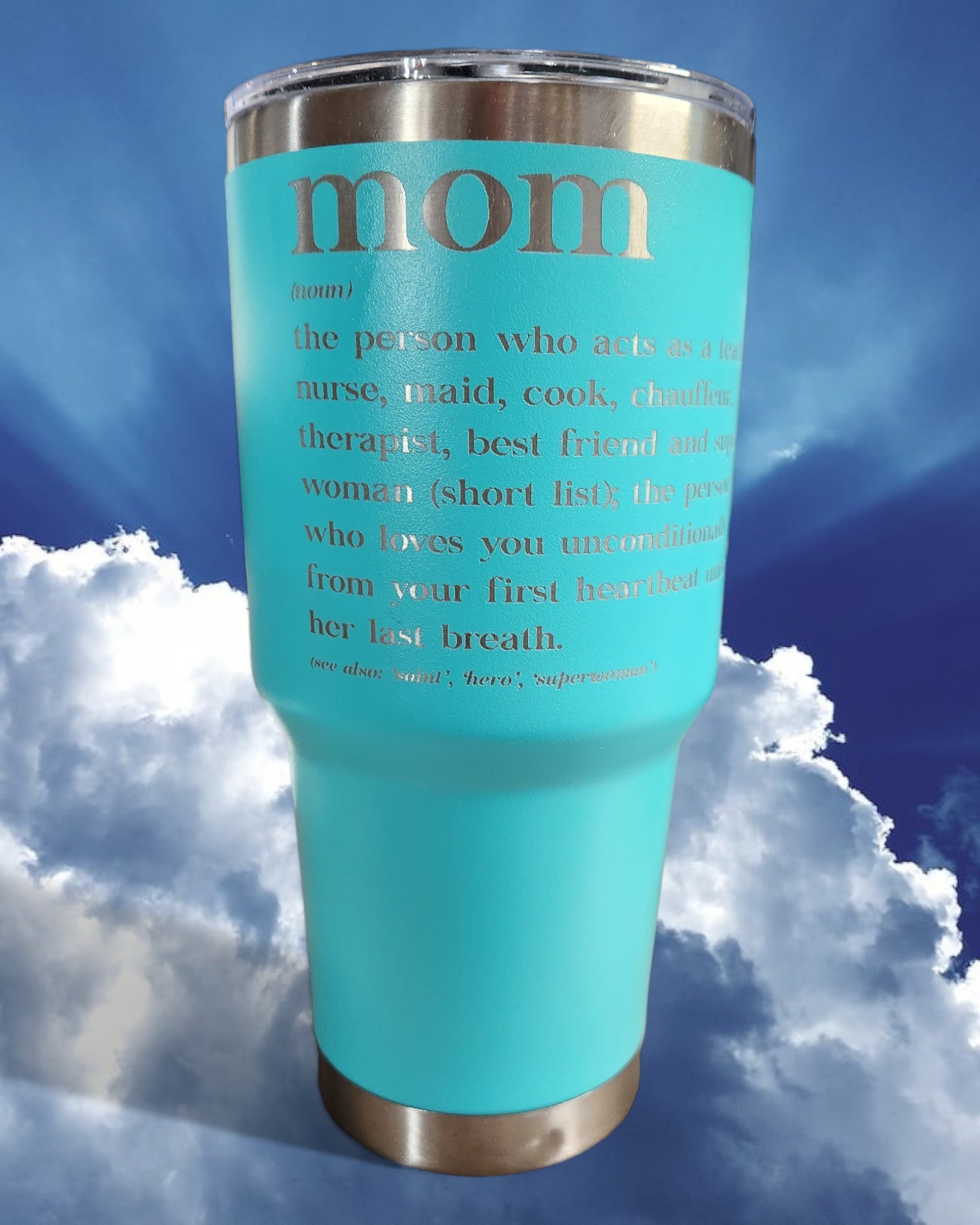 Celebrate Mom with our beautiful Turquoise Mother's Day Tumber. With a unique "Mom Definition" design and a 30 oz. capacity, this tumbler is perfect for keeping drinks hot or cold on the go. Show your appreciation all year round with this thoughtful gift.